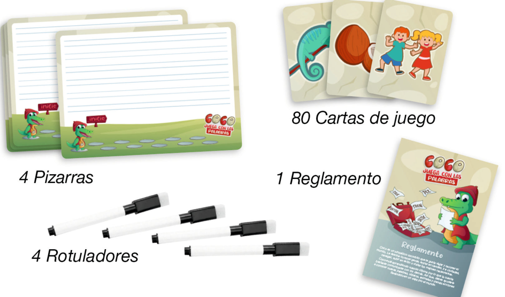 Cada jugador recibe un tablero individual y un rotulador. Durante la partida, deberán resolver distintos desafíos lingüísticos que se presentan en su tablero, como escribir palabras, dividir en sílabas, buscar sinónimos y antónimos, o incluso crear pequeños relatos.