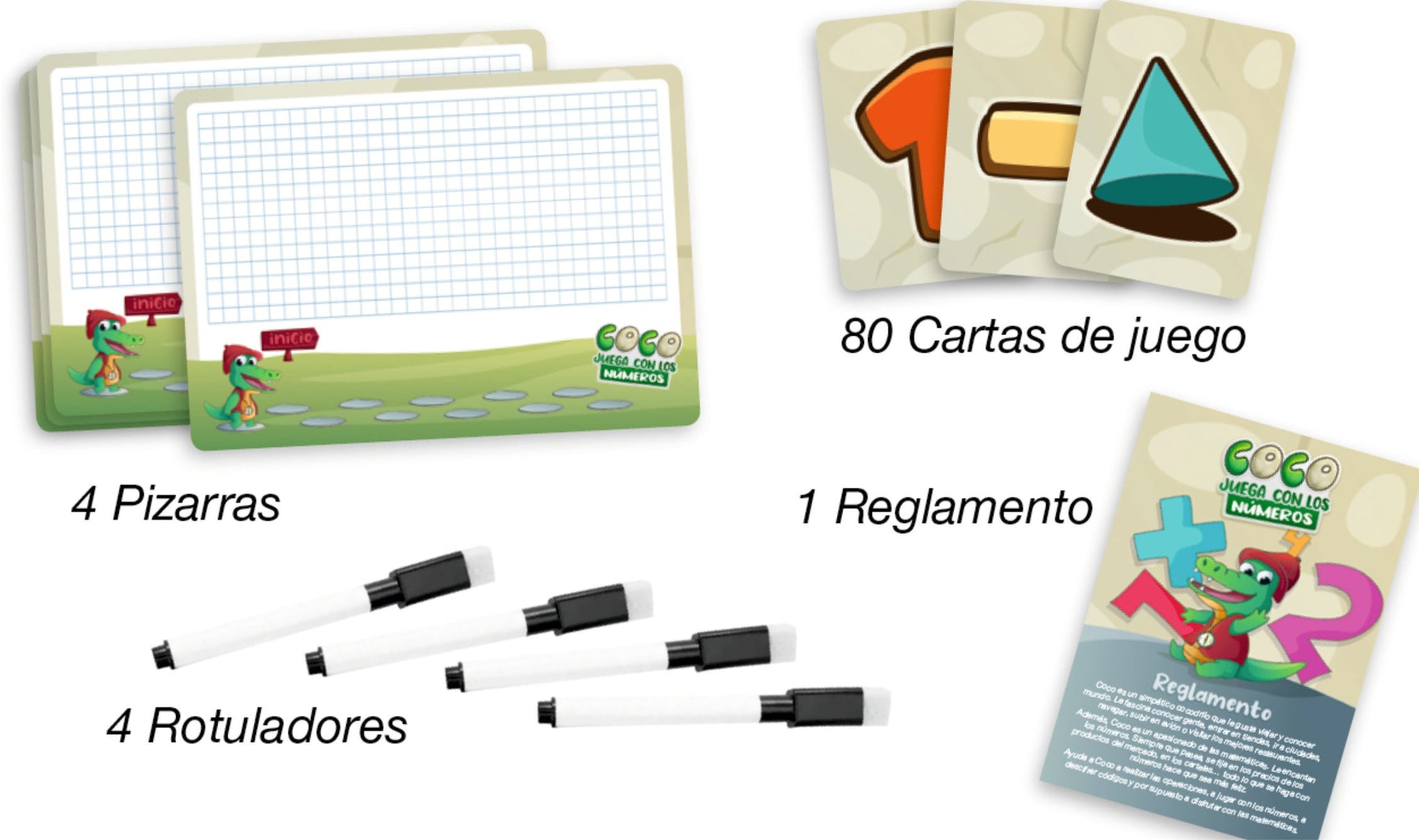 • 4 pizarras de cuadrados reutilizables y 4 rotuladores.